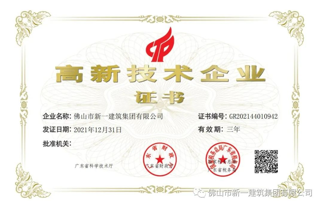 簡訊|佛山市新一建筑集團(tuán)有限公司取得“高新技術(shù)企業(yè)”證書